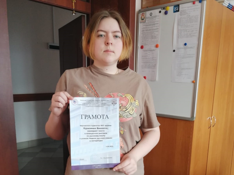 - В конкурсном диктанте среди студентов-нефилологов результаты следующие: 1 место заняла Куриленко Виолетта (941 гр.), 2 место – Шинжина Дарья (621 гр.), 3 место – Чептынов Дамир (621 гр.).