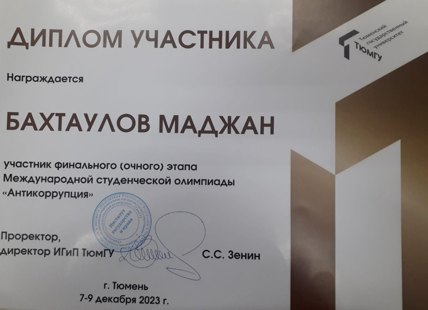 Студенты экономико-юридического факультета Горно-Алтайского государственного университета Марина Болдырева и Маджан Бахтаулов приняли участие в Международной студенческой олимпиаде «Антикоррупция», которую проводил Тюменский государственный университет для обучающихся образовательных программ бакалавриата, специалитета и магистратуры и обучающихся образовательных организаций высшего образования иностранных государств. Олимпиада проводилась в два этапа: дистанционный этап проходил в Российской Федерации с 25 по 28 апреля 2023 года, а в иностранных государствах с 30 мая по 2 июня 2023 года, очный этап – с 7 по 9 декабря 2023 года.